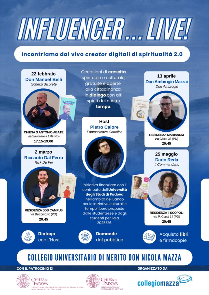 L’iniziativa è organizzata dal Collegio Mazza con il patrocinio dell’Ufficio per la Pastorale dei Giovani e dell’Ufficio per la pastorale dell’educazione e della scuola, della cultura e dell’università della Diocesi di Padova